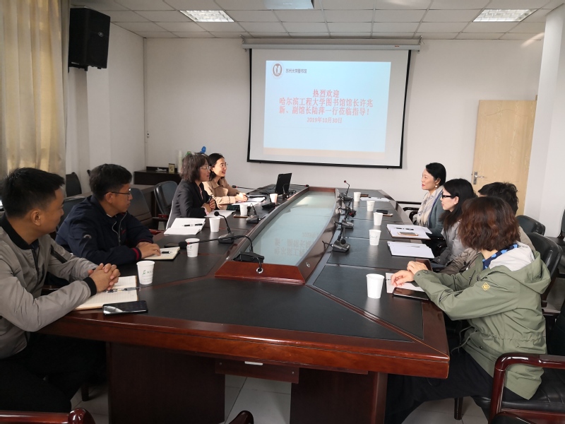 2019年10月30日上午,哈尔滨工程大学图书馆一行5人在馆长许兆新的带领下来我馆交流考察,同行的有该馆陆萍副馆长,阅读推广部、学习支持中心、技术保障保的陈曙光、吴景全、陶跃军主任。我馆徐燕副馆长进行了接待,资源建设部严大香主任、图书服务部孟良荣副主任、信息服务部孙富林副主任等参加了座谈交流。