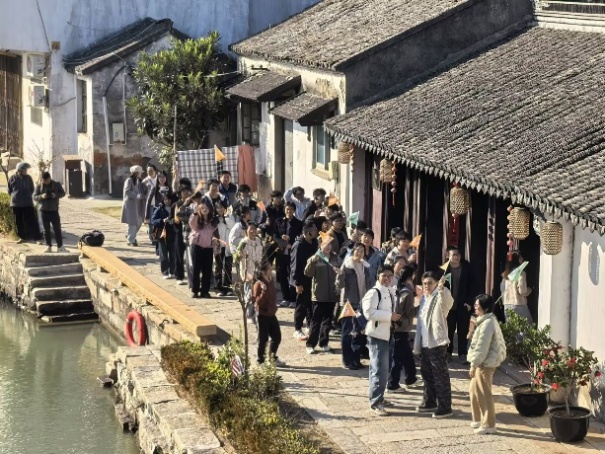 通风的窗棂,古银杏的金黄,古石桥的斑驳,名人故居的往事,“孝悌传家、耕读继世”的千年家风,让师生们追寻时光痕迹,沉浸式感受江南水乡的历史古韵;文创展示又让人感悟古镇“老底子”与“新活力”的和谐交融,深刻体会老街的当代文化价值。石板街上遛狗的路人、桥下拐角卖萝卜丝饼的摊位,河边的图书馆,古老的建筑包容了现代的烟火气与闲适,透着毫无违和感的古今碰撞,让师生们感受到身心的放松。