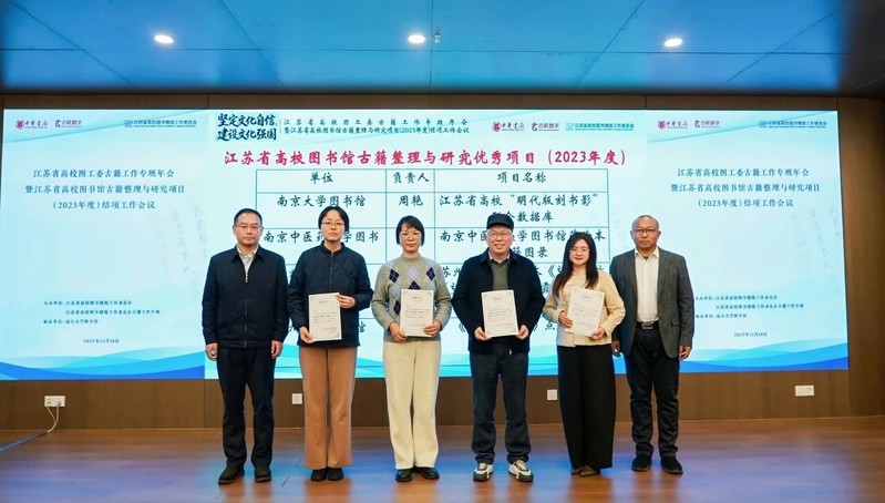2025年12月18日,江苏省高校图工委古籍工作专班年会暨江苏省高校图书馆古籍整理与研究项目(2023年度)结项工作会议在南京大学成功举办。会上,由江苏省教育厅高教处原一级调研员蔡华、南京图书馆副馆长陈立、清华大学图书馆副馆长魏成光、南京大学古典文献研究所教授武秀成、中华书局古联公司副总经理康宁临等业界权威组成的评审专家组对十六个项目进行了评审,所有项目均以高质量完成度全票通过结项,其中四项成果荣获优秀奖,我馆储开稳、陈勇华主持的《苏州大学馆藏稿本〈望岳图江标建霞 唐才常二贤遗迹〉价值研究》位列其中。