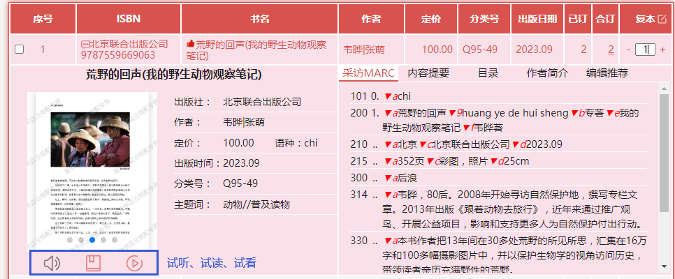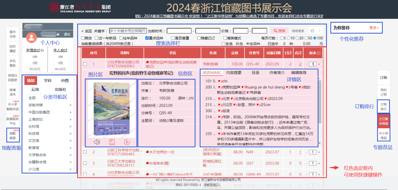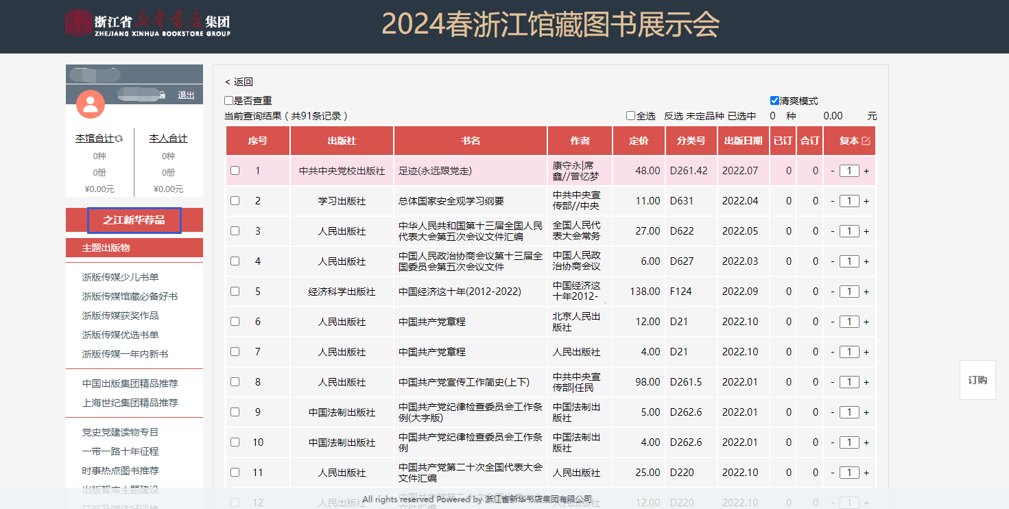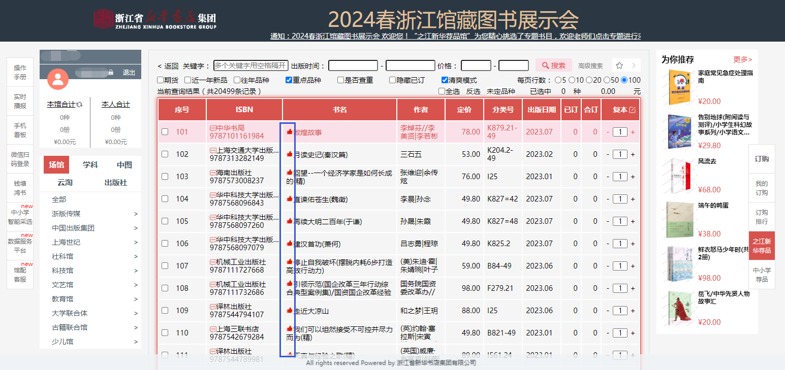b.读者可在选购页面进行订购、检索等操作,系统可按图书的中国图书馆分类、出版时间、定价等排序。也可按价格区间、出版时间段、重点图书进行模糊/精准筛选。