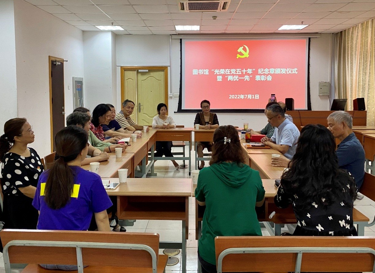 为庆祝中国共产党成立101周年,7月1日上午,图书馆举行了“光荣在党50年”纪念章颁发仪式暨“两优一先”表彰交流座谈会。图书馆党委委员、支部书记、退休党员骨干、预备党员参加了会议。会议由党委书记钱万里主持。