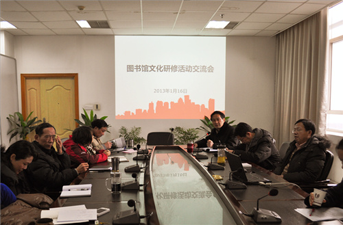 2013年1月16日上午,苏州大学图书馆在本部馆东三楼会议室召开了文化研修活动交流会。会议由党委周建屏书记主持,馆长罗时进,副馆长石明芳、李峰、徐燕,各部门主任和各文化研修小组成员参加了会议。