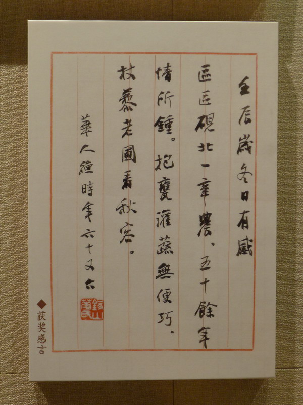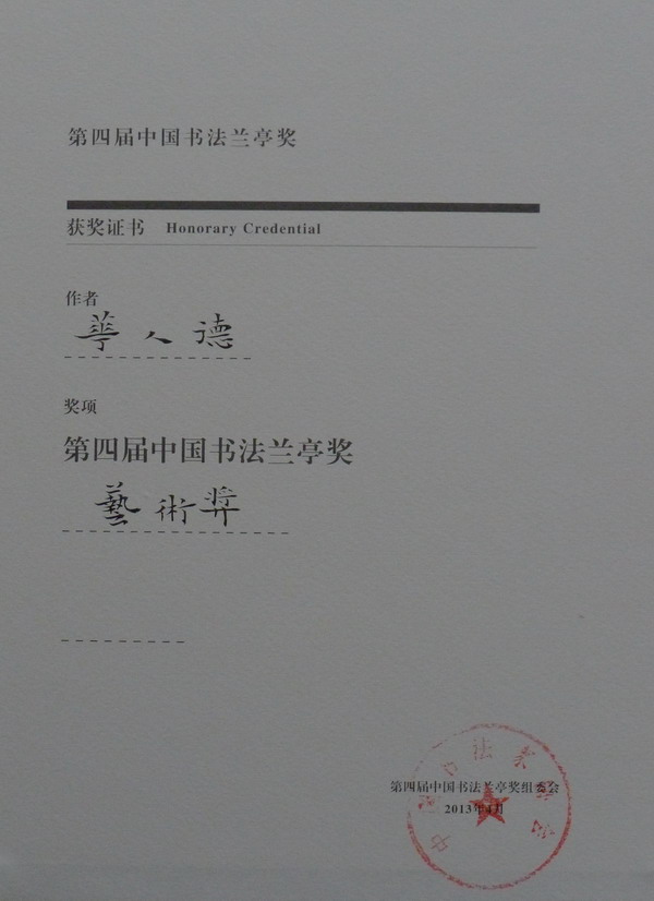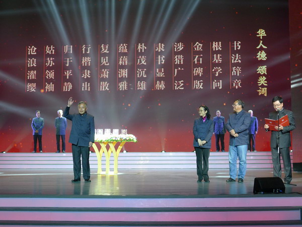 2013年4月11日下午,中国书法界的盛会 —— 第四届中国书法兰亭奖在浙江绍兴博物馆隆重开幕,350余件获奖作品和成果在绍兴博物馆展出。海内书法名家咸集绍兴,群星荟萃,我校东吴书画院院长、博士生导师华人德先生作为兰亭奖艺术奖获得者参加了此次活动。 ![]() 中国书法兰亭奖是经中宣部批准,中国文联和中国书法家协会共同主办的全国综合性书法专业奖项,与中国戏曲梅花奖、中国电影金鸡奖、中国电视金鹰奖一样,为全国文艺领域最高奖项。“兰亭奖”创立于2001年,每三年举办一届,之前已举办过三届。 开幕式后,华人德先生接受了香港卫视的现场采访,在问及获奖感受时,他笑着说:“每次获奖都要问我感言,我已是第四次获兰亭奖,心情很平静,写了首诗,‘区区砚北一辛农,五十余年情所钟。抱瓮灌蔬无便巧,杖藜老圃看秋容。’书法是我的爱好,就象在菜地里种瓜种蔬一样,辛勤的耕耘和灌溉,不贪求便利和机巧,50年后种瓜得瓜,种豆得豆,拄着拐杖来到菜地,看到了应有的丰收景象。”华先生平实的诗句给人以不平凡的启示意义。 ![]() ![]() 4月11日晚,盛大隆重的兰亭奖颁奖晚会在绍兴大剧院举行,60名获奖者上台领奖,其中理论奖19人、佳作奖28人、艺术奖10人、终身成就奖3人。艺术奖和终身成就奖获得者上台领奖时每人都有中国书协对其学术评价的颁奖词,华人德先生的颁奖词是:书法辞章,根基学问;金石碑版,涉猎广泛;隶书显赫,朴茂沉雄;蕴藉渊雅,复见萧散;行楷隶出,归于平静;姑苏领袖,沧浪濯缨! ![]() 其余9位艺术奖获得者分别是:黄惇、曹宝麟、丛文俊、孙晓云、王冬龄、林剑丹、吴行、王友谊和张荣庆,终身成就奖的申报条件是年满75周岁的当代著名书法家,获奖三人分别是尉天池、陈方既和刘艺先生。 ![]() ![]() |