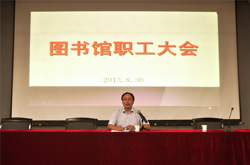 2013年8月30日下午二点在本部图书馆五楼学术报告厅召开了全馆职工大会,全体馆领导和馆员出席了本次会议。会议由周建屏书记主持,他首先向大家介绍了图书馆新进职工,接着由唐忠明馆长作上学期工作总结和新学期工作计划,唐馆长对各位馆员上学期所作的工作进行了肯定,对接下来的全员岗位聘任工作、阳澄湖校区的并馆工作、图书馆数据库维护工作和学术周活动进行了相关布置。唐馆长还向大家公布了图书馆领导班子的分工调整情况,对全体职工接下来的选岗工作进行了动员。