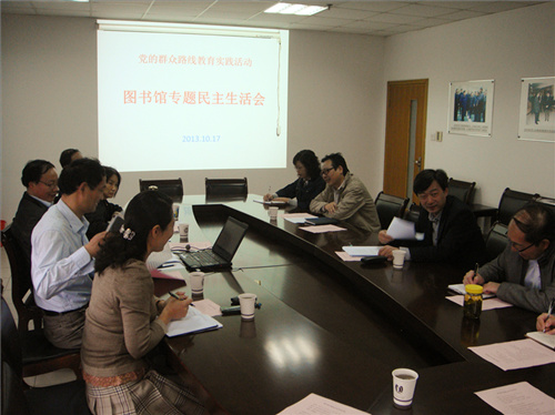 图书馆党的群众路线教育实践活动专题民主生活会于2013年10月17日上午在本部西三楼会议室召开,分管图书馆工作的校领导田晓明副校长,校督导组施亚东副书记到会指导,全体馆领导班子成员、馆党委委员、党风联络员、办公室主任、工会主席参加了本次民主生活会。会议由馆党委周建屏书记主持。